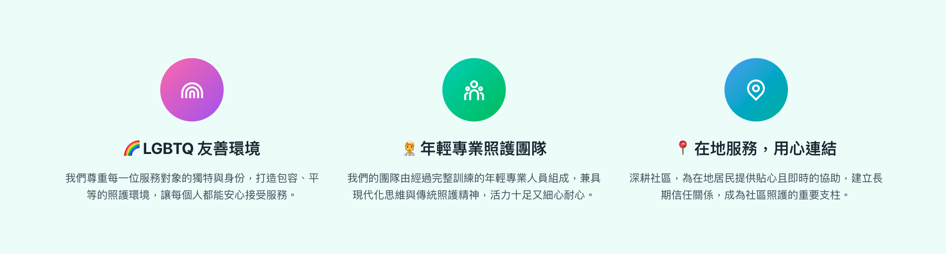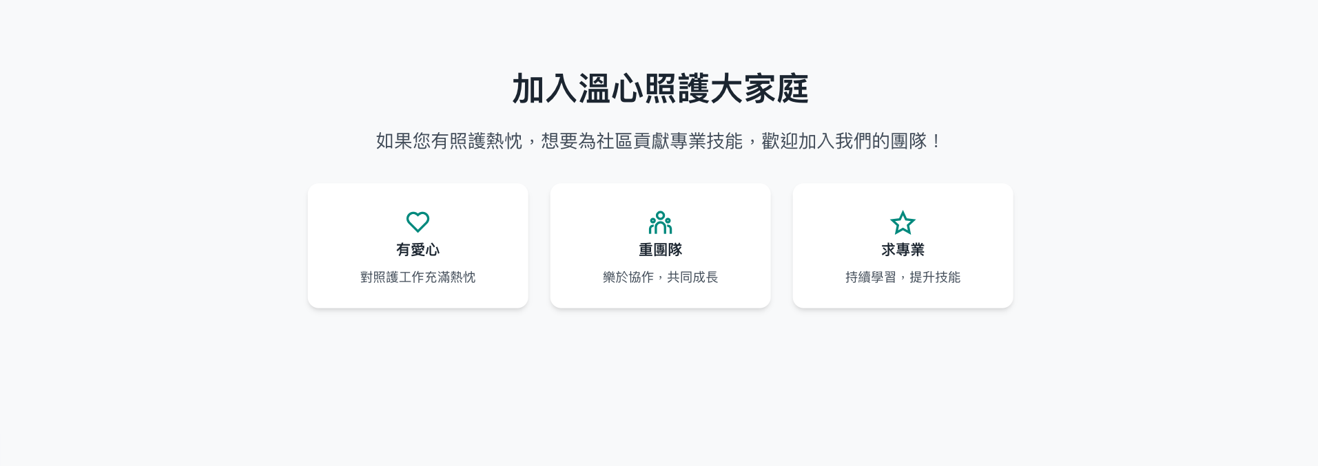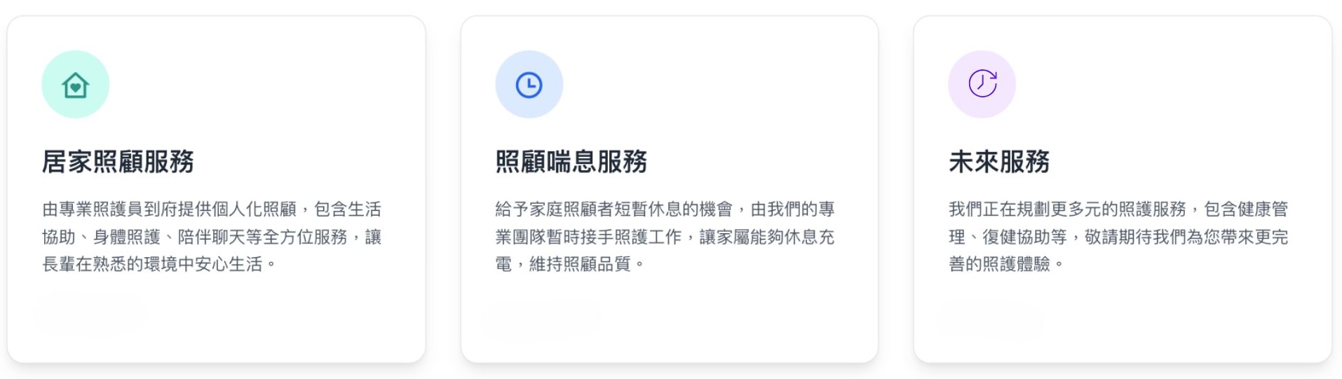 我們的服務 專業、貼心、值得賴的照護服務 了解更多 ➜ 了解更多 ➜ 敬請期待 ➜ 我們的特色 用心、專業、包容的照護團隊 預約免費諮詢 預約免費諮詢 預約免費諮詢 加入 LINE@ 最新消息 掌握最新資訊及公告 One visit $7 Massa ultricies mi quis. hendrerit dolor magna eget. Nullam eget felis eget nunc lobortis. Buy now